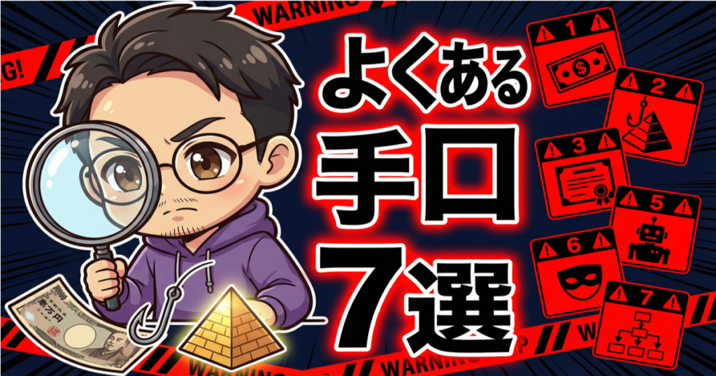 ✅ 代表的な手口は7つ。誇大広告・高額スクール・LINE誘導・サクラコミュニティ・自動ツール販売・緊急性演出・テンプレ量産型