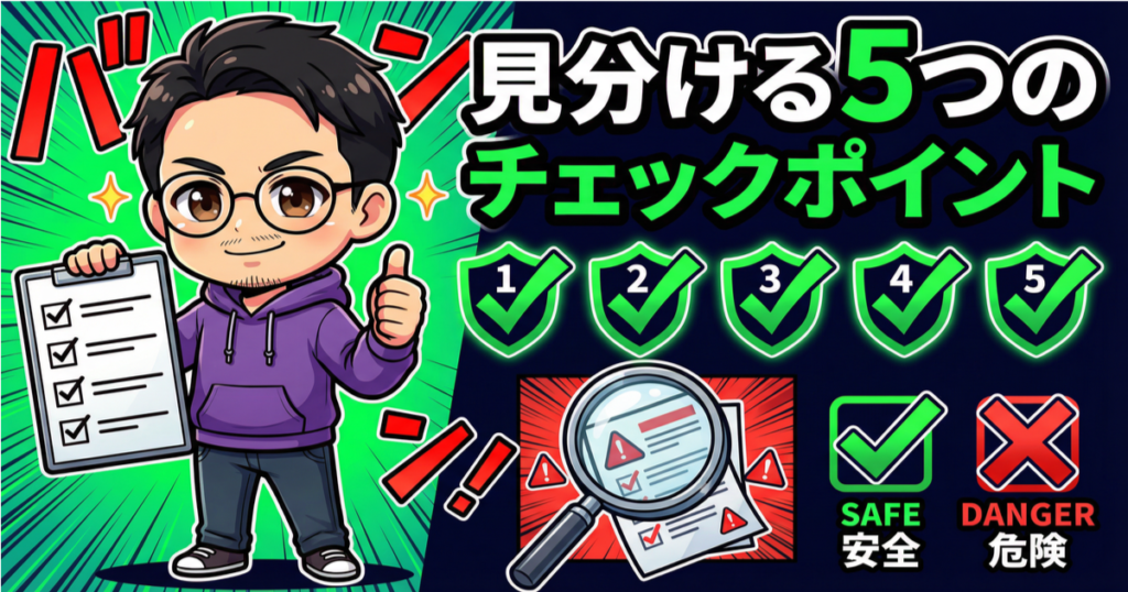 ✅ 見分けるチェックポイントは5つ。作業内容の具体性・事前費用の有無・特商法表記・口コミ・収益保証