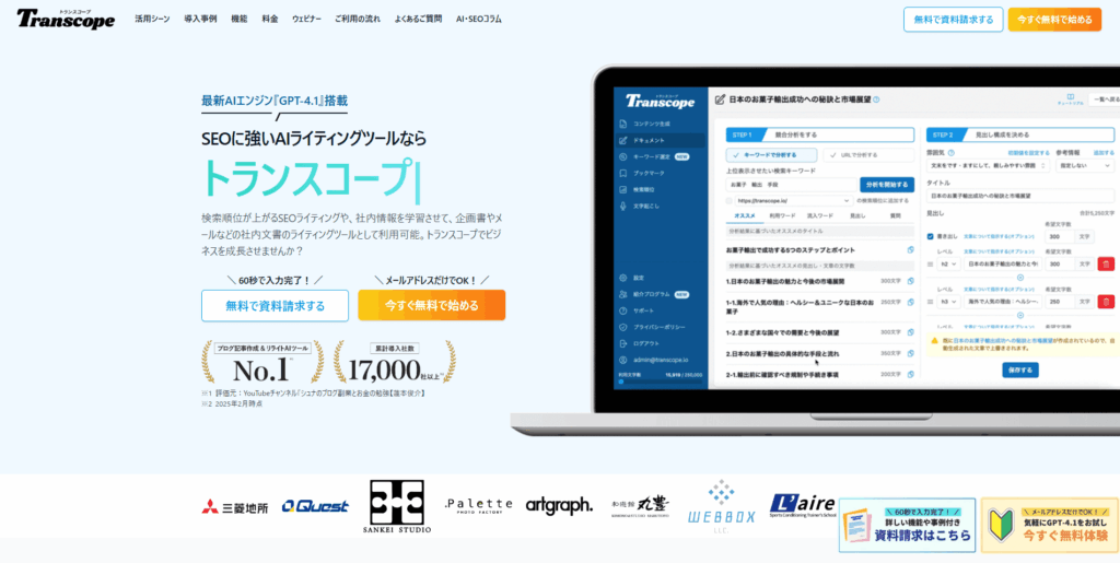 文章作成にかかる時間を従来の10分の1以下に短縮でき、ライティングスキルに関係なく高品質な文章を作成できるため、ブログ運営者、Webライター、マーケティング担当者など幅広い層に活用されています。