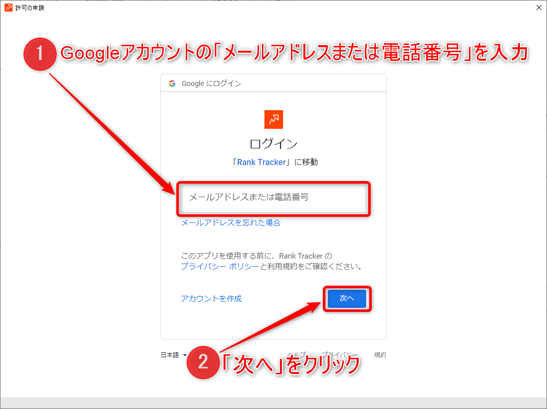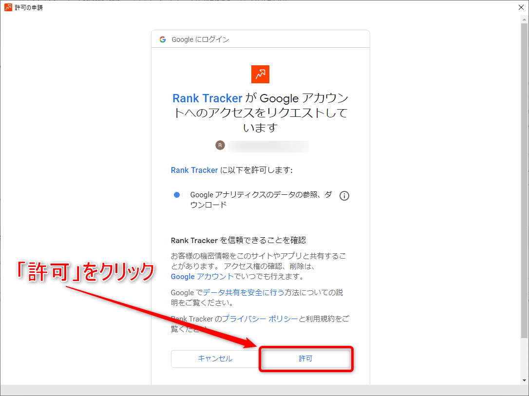 Rank TrackerがGoogleアカウントにアクセスできるように「許可」をクリック。
