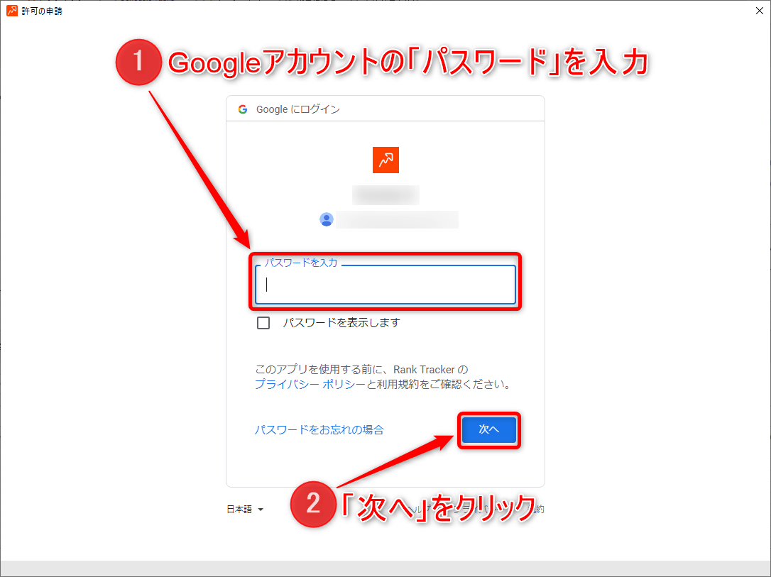 続いて、Googleアカウントの「パスワード」を入力し、「次へ」をクリック。