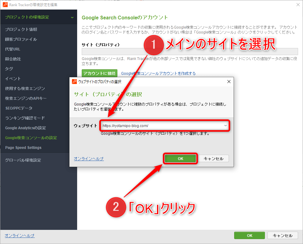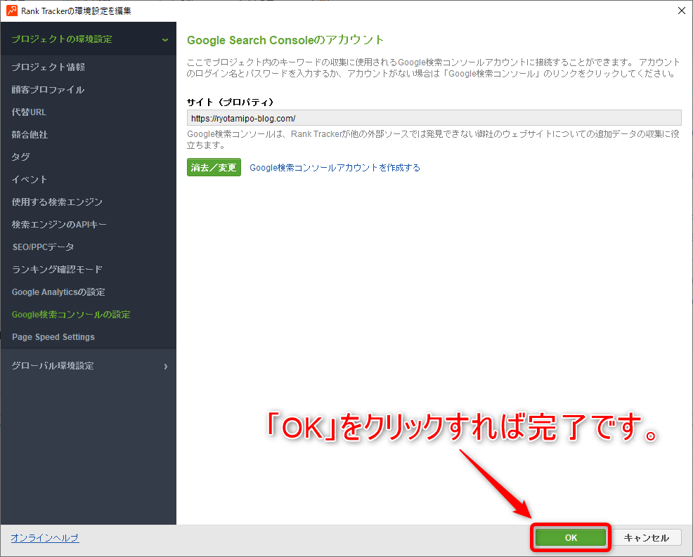 最後にもう一度「OK」をクリックすれば、Rank TrackerにGoogleサーチコンソールの連携が完了です。